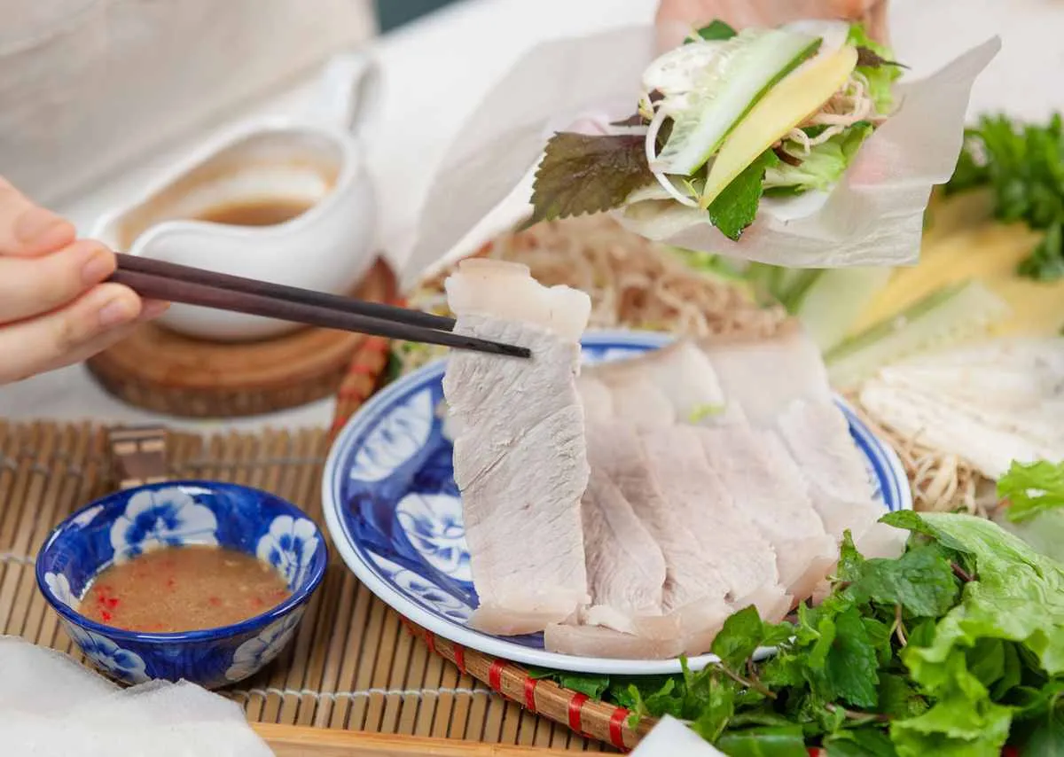 Điều làm nên linh hồn món ăn nằm ở miếng thịt hai đầu da – phần thịt ba chỉ nhưng được cắt khéo để phần da nằm ở cả hai đầu miếng. Khi luộc đúng lửa, miếng thịt có tỉ lệ nạc – mỡ – da hài hòa: Da giòn, mỡ mềm, nạc ngọt tự nhiên. Khi thái lát dày vừa phải, mỗi miếng thịt trở thành nhân hoàn hảo để cuốn, không bị khô cũng không quá béo.
