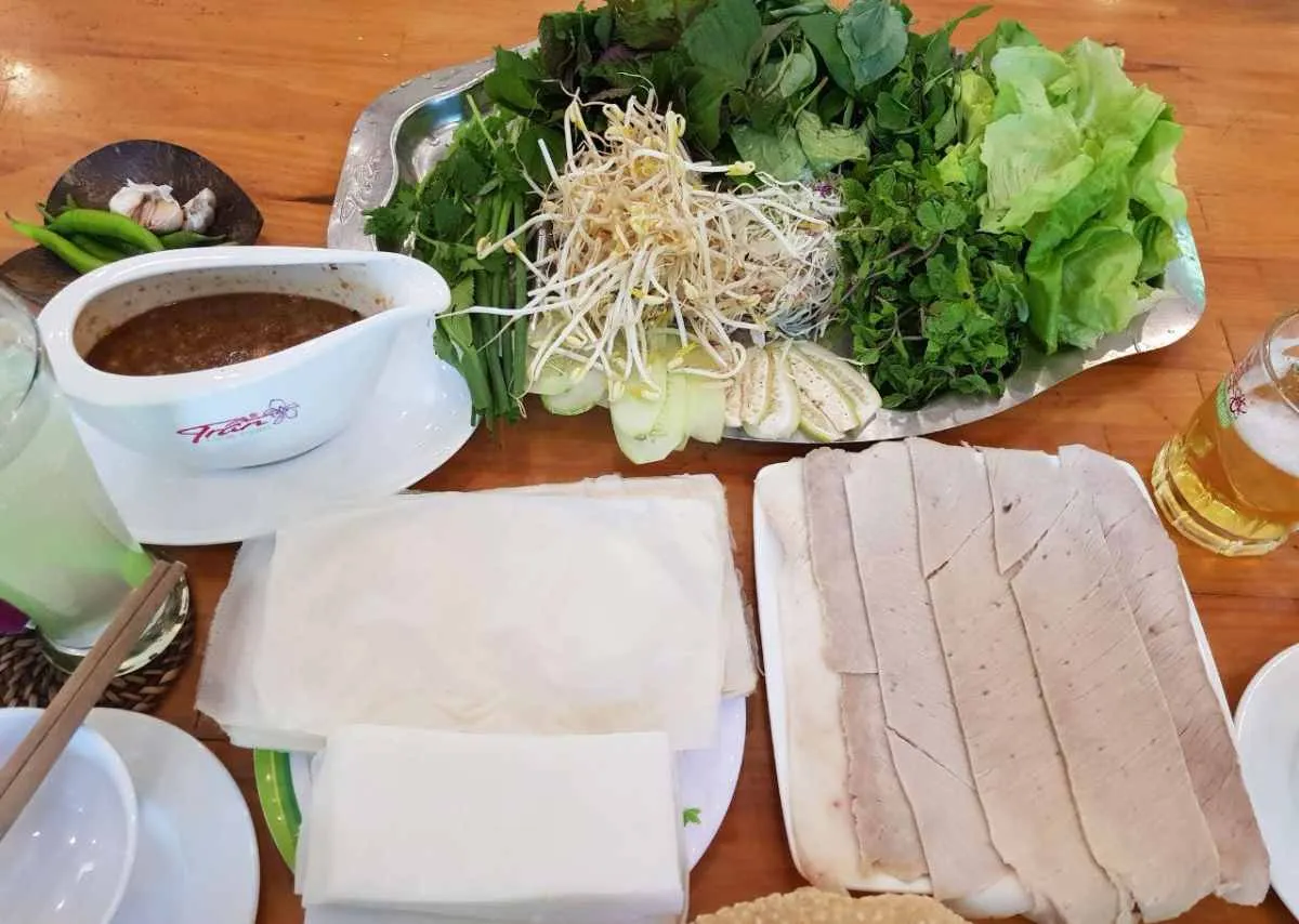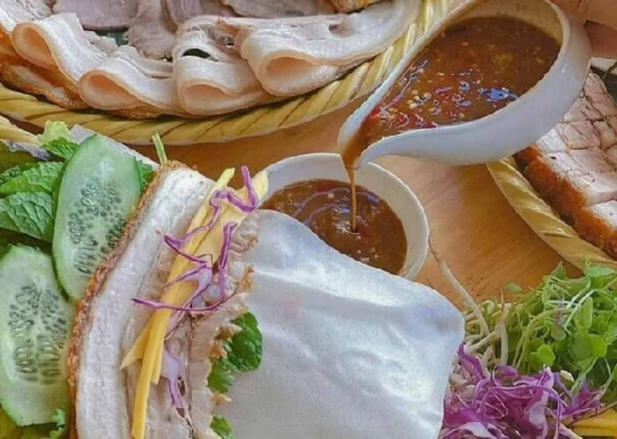 Bánh tráng cuốn thịt heo không phải món dành cho sự vội vàng. Nó cần người cuốn, cần người cùng ngồi cạnh. Trên bàn, ai cũng tự tay cuốn phần của mình — bánh tráng, bánh ướt, rau sống, thịt heo, rồi chấm mắm nêm. Một món ăn mà niềm vui đến từ chính khoảnh khắc thưởng thức.
