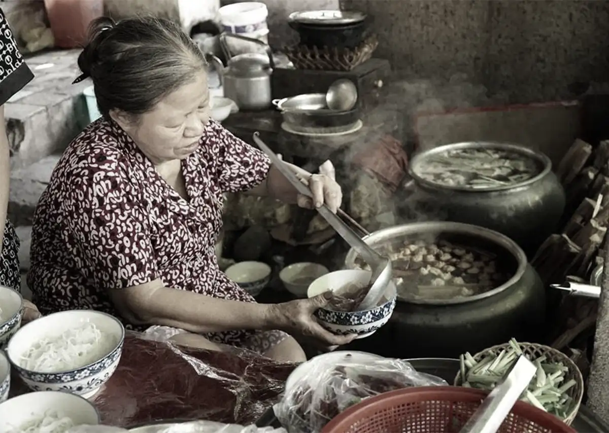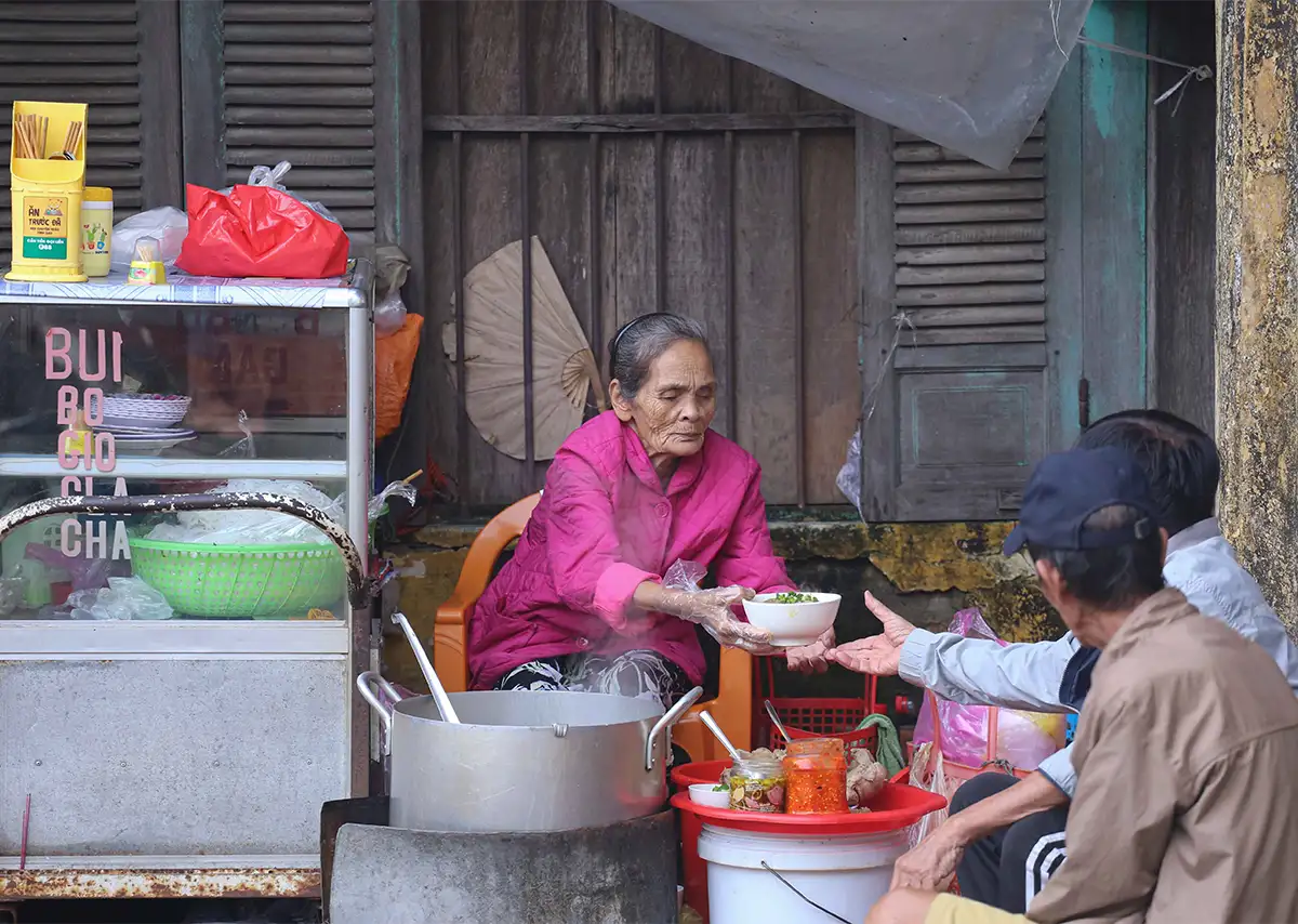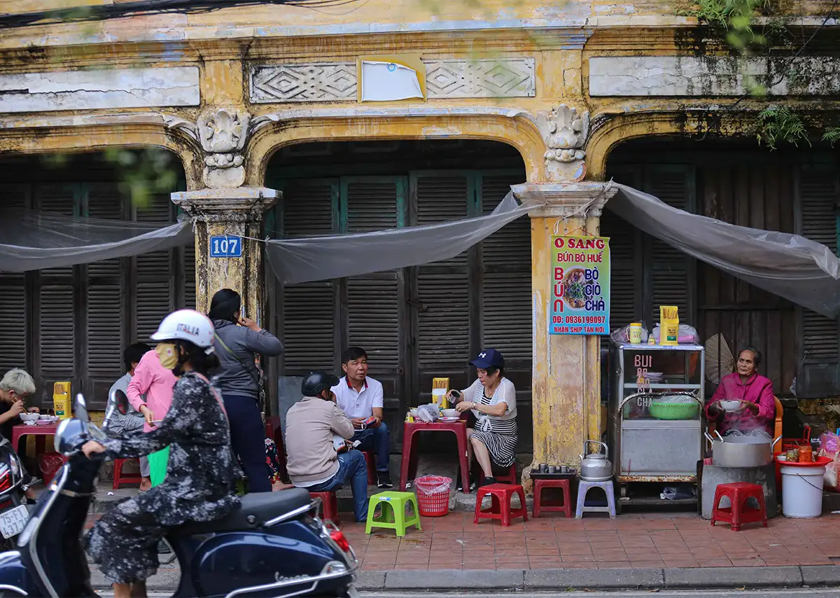 Ở Huế, bún bò không cần tìm đâu xa. Nó có mặt trong quán nhỏ đầu ngõ, gánh hàng rong ven đường, hay những nồi nước lèo to tỏa khói buổi sớm. Trong màn sương mỏng, tiếng rao “ai ăn bún bò không…” vang lên, thành một mảnh âm thanh thân thương của đời thường.