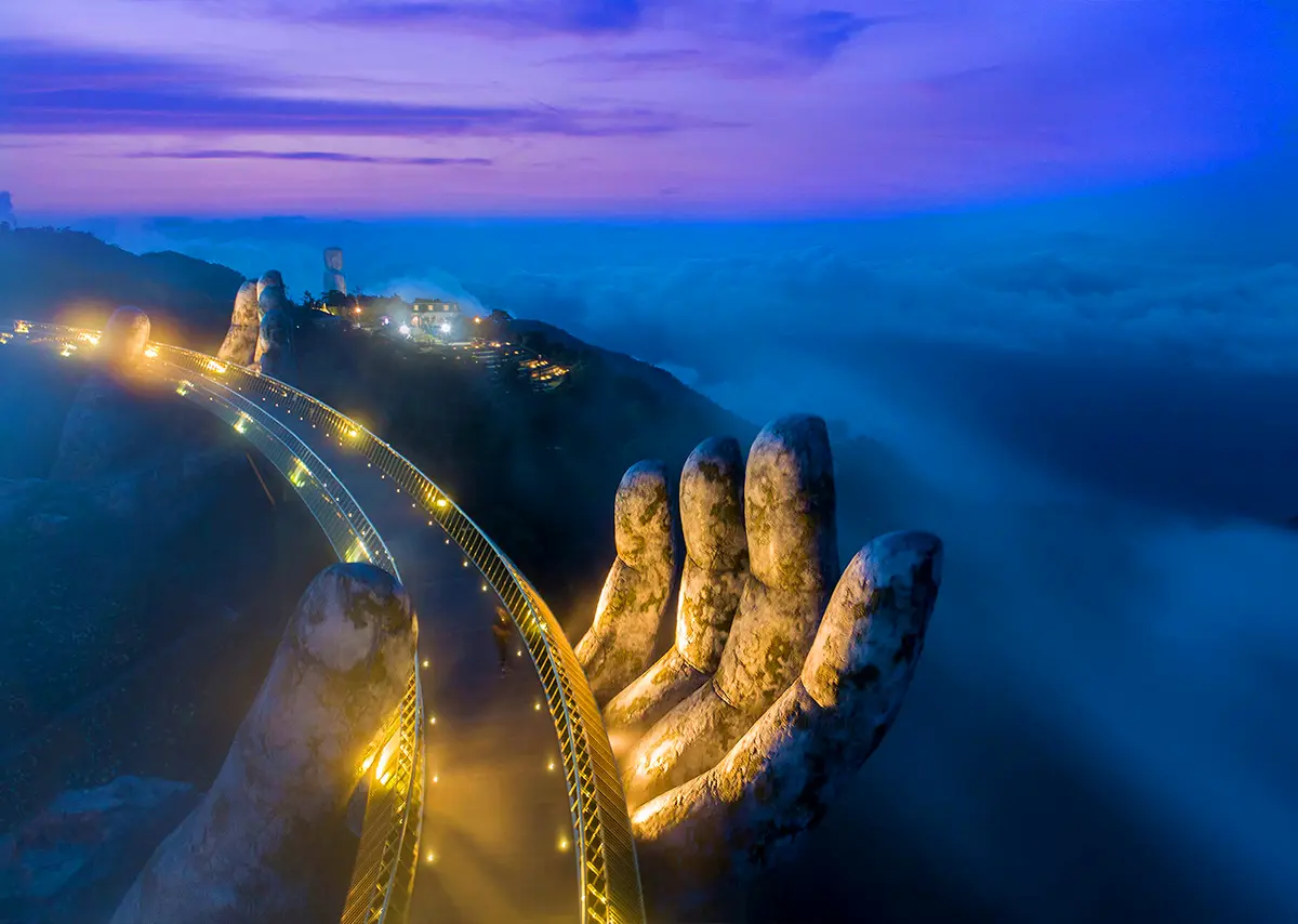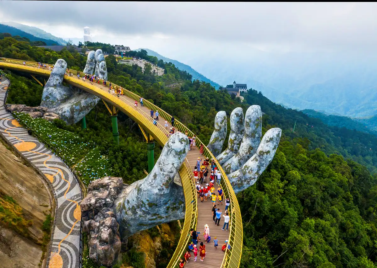 Khánh thành năm 2018, Cầu Vàng Đà Nẵng nhanh chóng trở thành “ngôi sao” trên bản đồ du lịch thế giới. Nằm ở độ cao gần 1.500m, cây cầu dài 150m như một dải lụa vàng mềm mại vắt ngang bầu trời. Đôi bàn tay đá khổng lồ rêu phong, trầm mặc như đã hiện hữu hàng ngàn năm, ôm lấy dải cầu trong sự nâng niu.