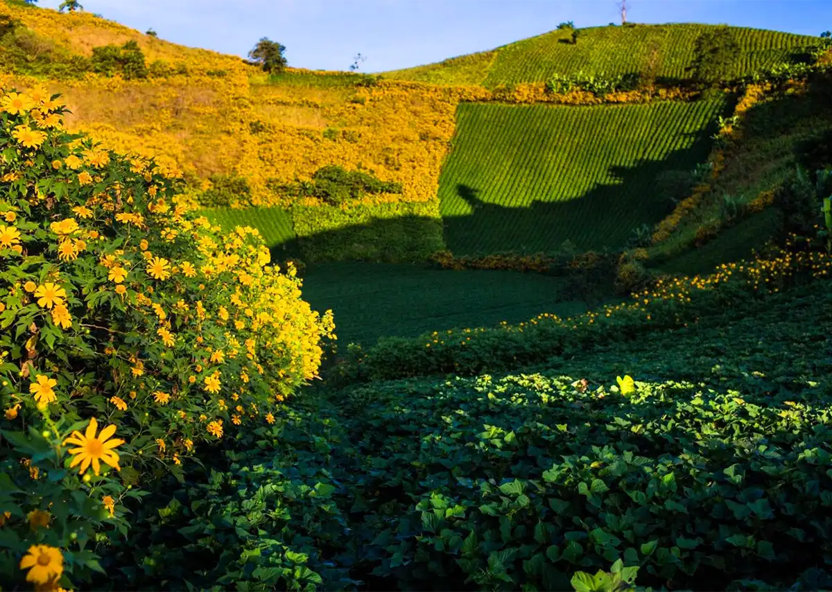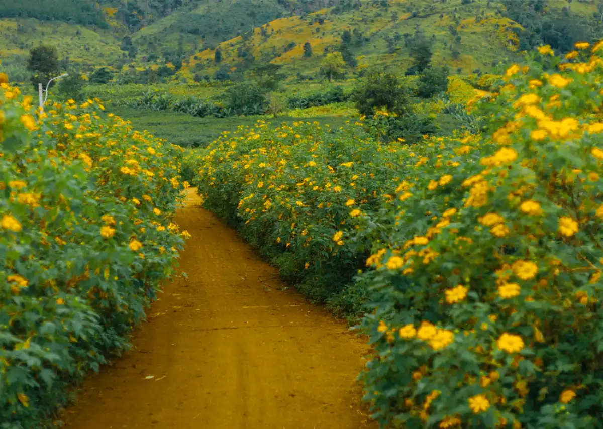 Khi thu sang đông tới, màu vàng rực của dã quỳ lại lên ngôi. Cả ngọn núi khoác lên tấm áo vàng ấm áp, tựa như nụ cười hồn nhiên của đất trời Tây Nguyên. Chính sự chuyển giao ấy đã tạo nên hai gam màu đặc trưng: đỏ của dong riềng, vàng của dã quỳ – lời mời gọi tha thiết khiến bất kỳ ai cũng muốn tìm về.