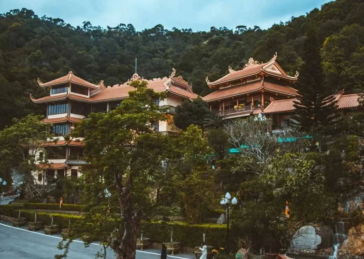 Điểm độc đáo nhất của đền chính là thế phong thủy “tọa sơn hướng hải”: dựa lưng vào núi, mặt nhìn ra biển lớn. Từ đền Thượng — vị trí cao nhất — vịnh Bái Tử Long hiện ra như bức tranh sống động: sóng nước xanh ôm lấy mũi đá nhấp nhô.