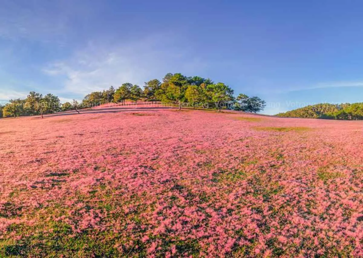 Giữa cái se lạnh đặc trưng của cao nguyên Đà Lạt, có một nơi khi bình minh vừa hé, cả ngọn đồi bỗng hóa thành biển hồng dịu êm — Đồi cỏ hồng. Ánh nắng đầu ngày khẽ chạm lên từng nhành cỏ li ti, khiến chúng ánh lên như những nụ cười của sương mai, tinh khôi và trong trẻo đến nao lòng. Ở đó, người ta không chỉ ngắm một khung cảnh đẹp, mà còn cảm nhận được hơi thở dịu dàng của thiên nhiên, nghe lòng mình lắng lại giữa khoảng trời mờ sương.