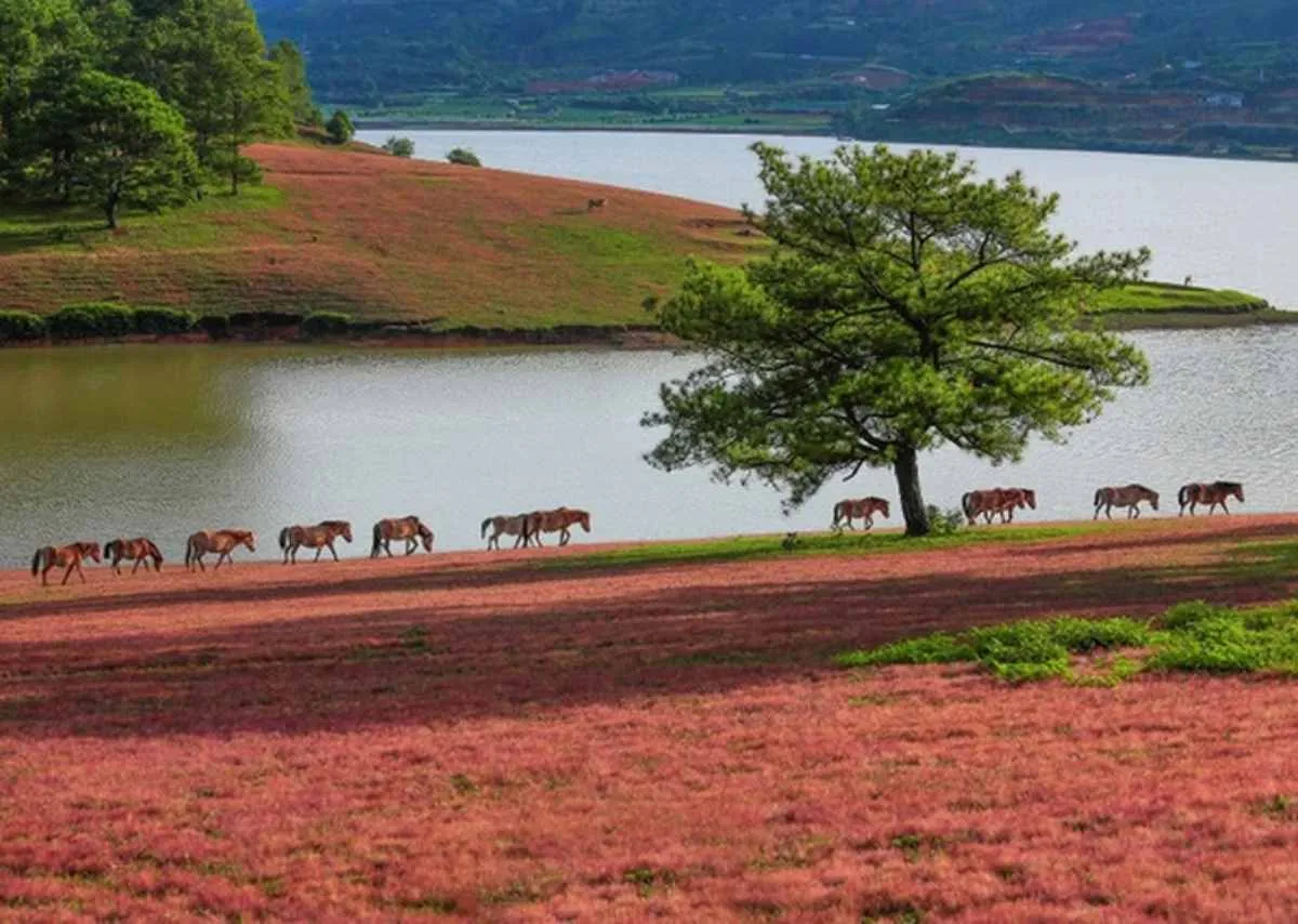 Đồi cỏ hồng không chỉ có cỏ. Xa xa là hàng thông cao vút, là mặt hồ Suối Vàng phẳng lặng, soi bóng mây trời. Tất cả tạo nên bức tranh thiên nhiên hài hòa, nơi mọi gam màu, xanh, hồng, vàng, quyện lại thành một bản giao hưởng của sự sống.