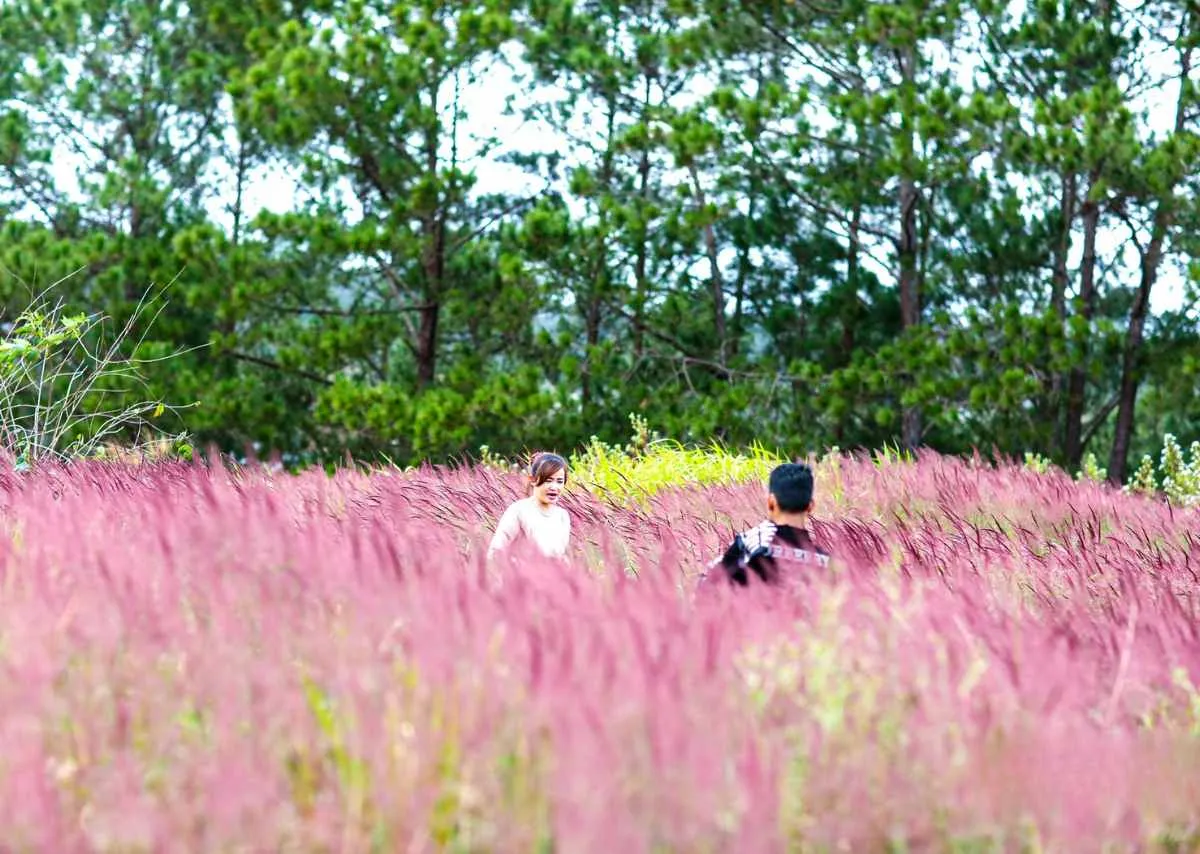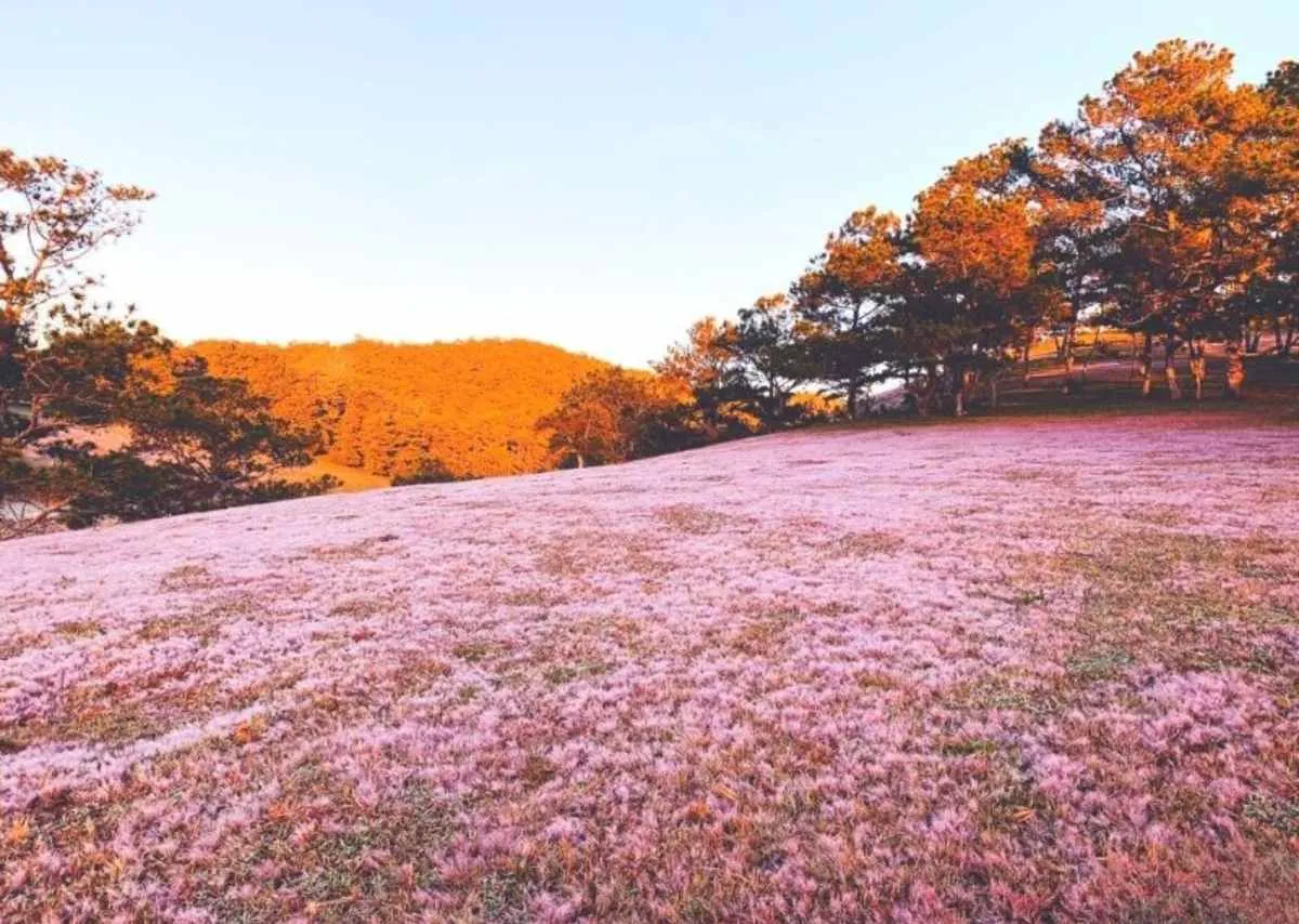 Đồi cỏ hồng đẹp nhất khi mặt trời vừa ló rạng, tầm 5h30 – 6h30 sáng. Lúc đó, nắng chưa gắt, sương vẫn còn dày, và ánh sáng vàng nhạt phủ lên màu hồng phớt của cỏ, tạo nên khung cảnh mờ ảo như cổ tích. Đó là thời điểm mà nhiếp ảnh gia nào cũng chờ đợi, còn người yêu Đà Lạt nào cũng muốn được một lần chứng kiến.