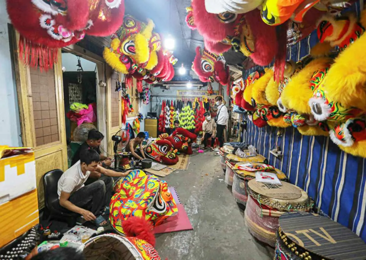 Những chiếc đầu lân được làm thủ công, khung tre uốn cong, giấy bồi và sơn son thếp vàng. Mỗi màu sắc đều mang ý nghĩa riêng: đỏ tượng trưng cho hỷ khí, vàng là thịnh vượng, xanh là bình an. Thân rồng thường dài hàng chục mét, uốn lượn như sóng – biểu trưng cho khí thiêng của non sông Việt.