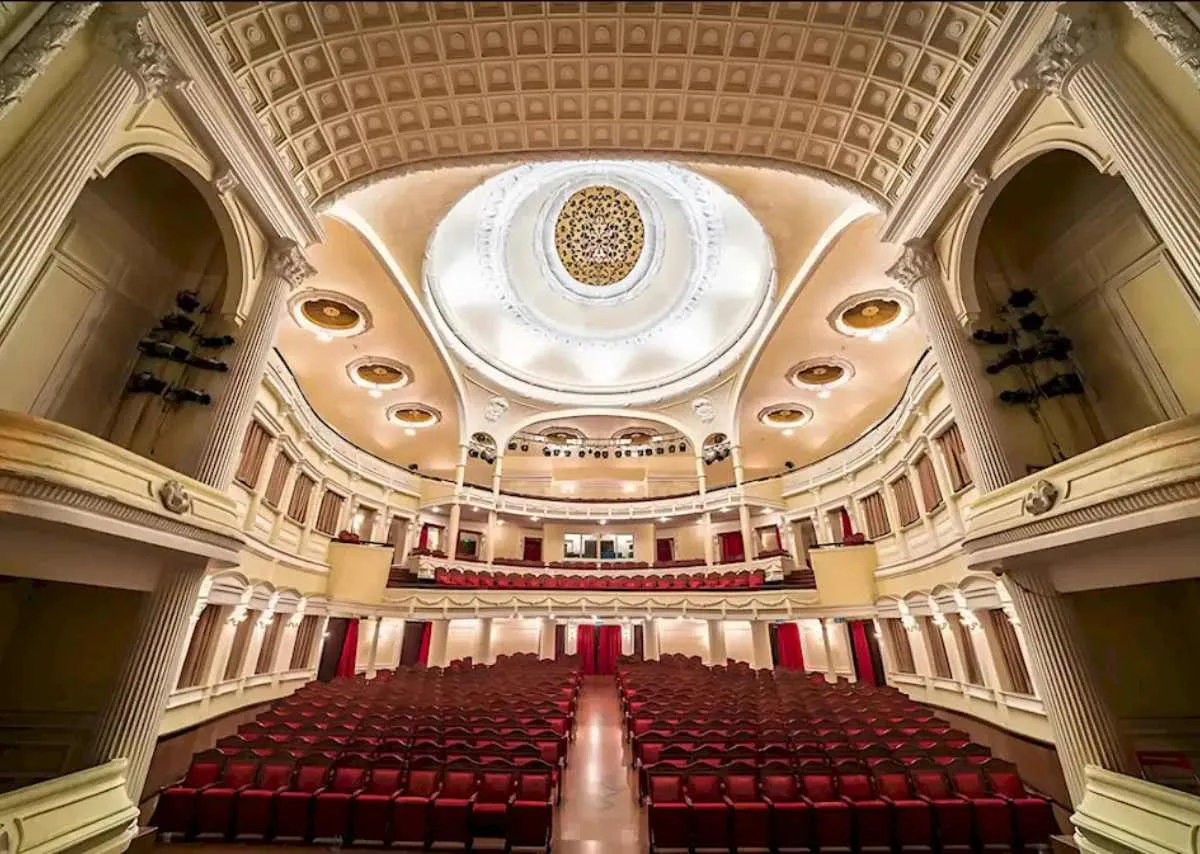 Nhà hát được xây dựng theo phong cách Baroque cổ điển với mái vòm cao, cột Corinth uy nghi, cùng những đường cong mềm mại và hoa văn chạm trổ tinh tế. Gam màu vàng nhạt pha trắng tạo cảm giác sang trọng mà ấm áp.